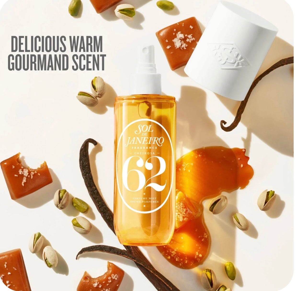 A body fragrance mist, bursting with an alluring pistachio and salted caramel scent, to be used on body, hair, and lingerie.